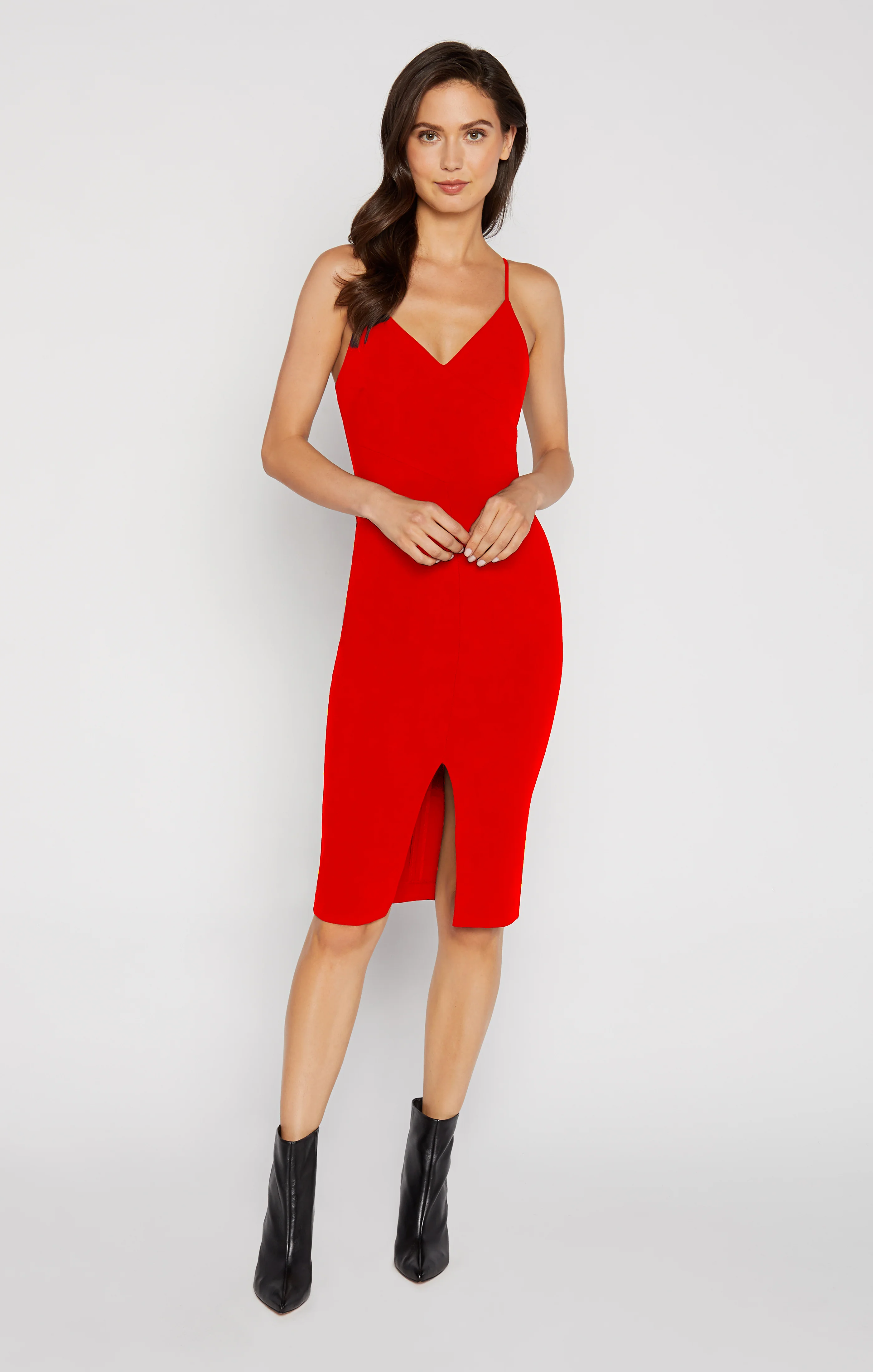 This sleek, fitted dress will make jaws drop with its subtle, yet bold, front slit and strappy V-cut top.