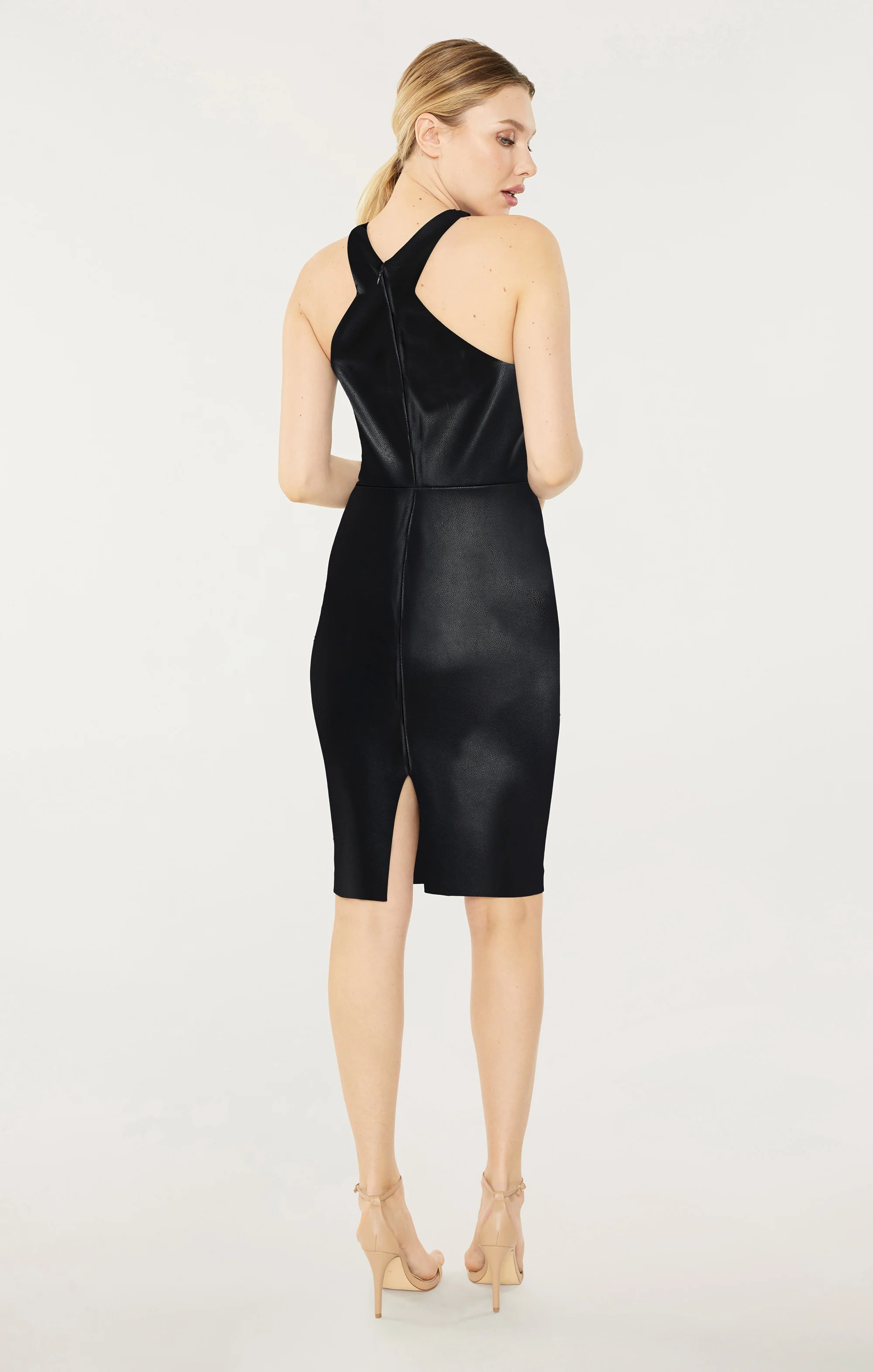 The jaw dropping Faux Leather Carolyn Dress is sure to impress no matter where you wear it to! Features a halter neckline and fitted bodice, it's the perfect little black dress.