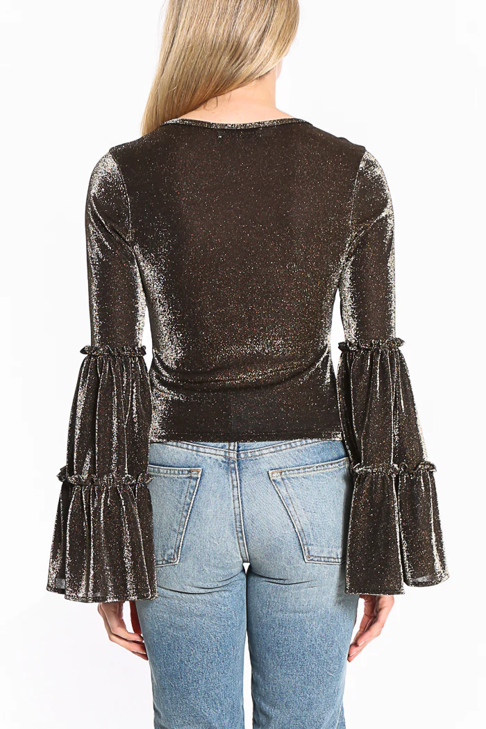 All that glitters is gold! The Freya top has gathered tiered sleeves accompanying the GNO-ready metallic fabric.