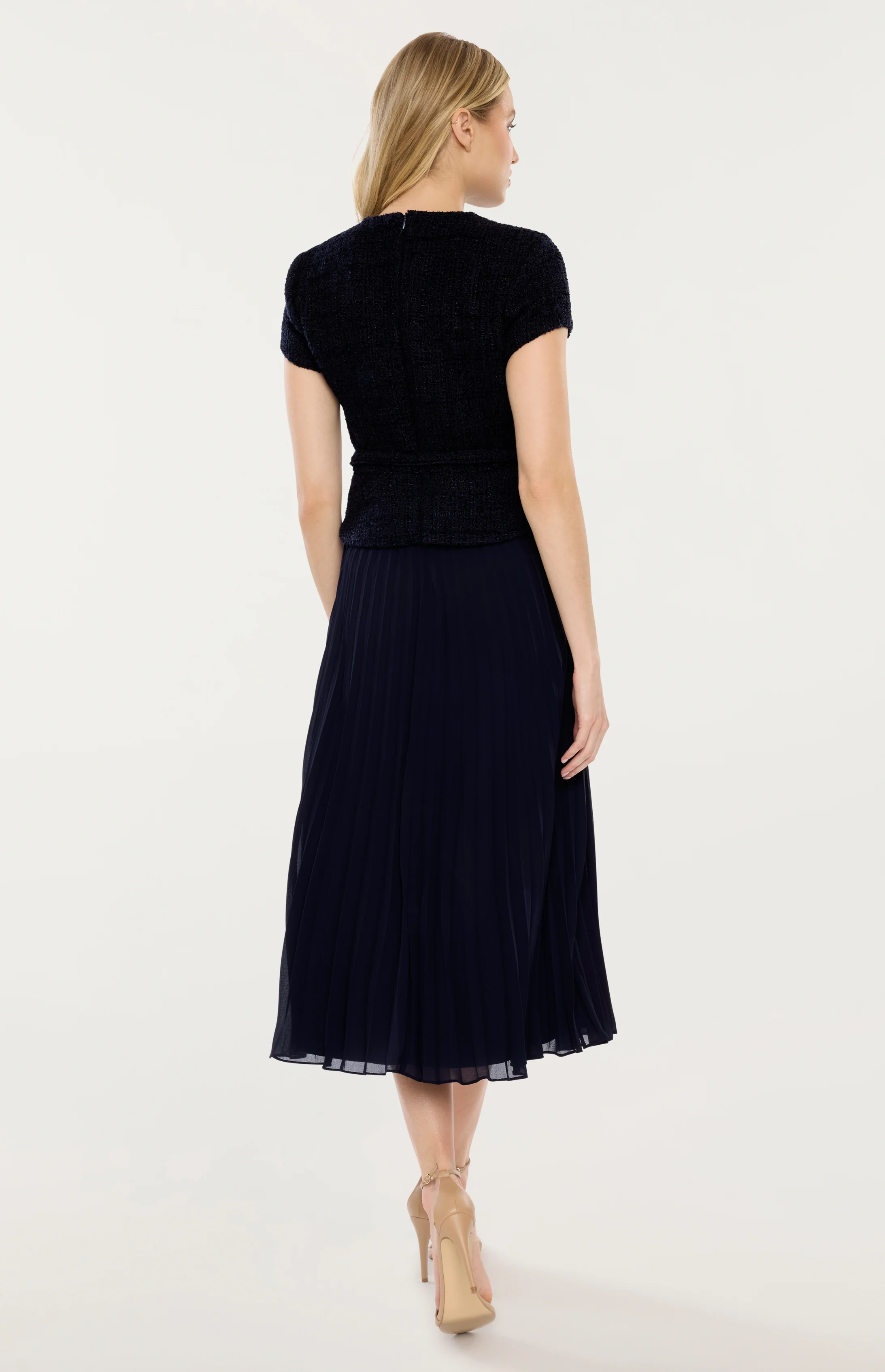 Embrace your unique style with the Navy Pamela Dress. The pleated skirt and cinched waist create a flattering figure, while the embellished buttons and neckline add a touch of sophistication. The square neckline and short sleeves add a modern twist, making this midi dress the perfect choice for any event.