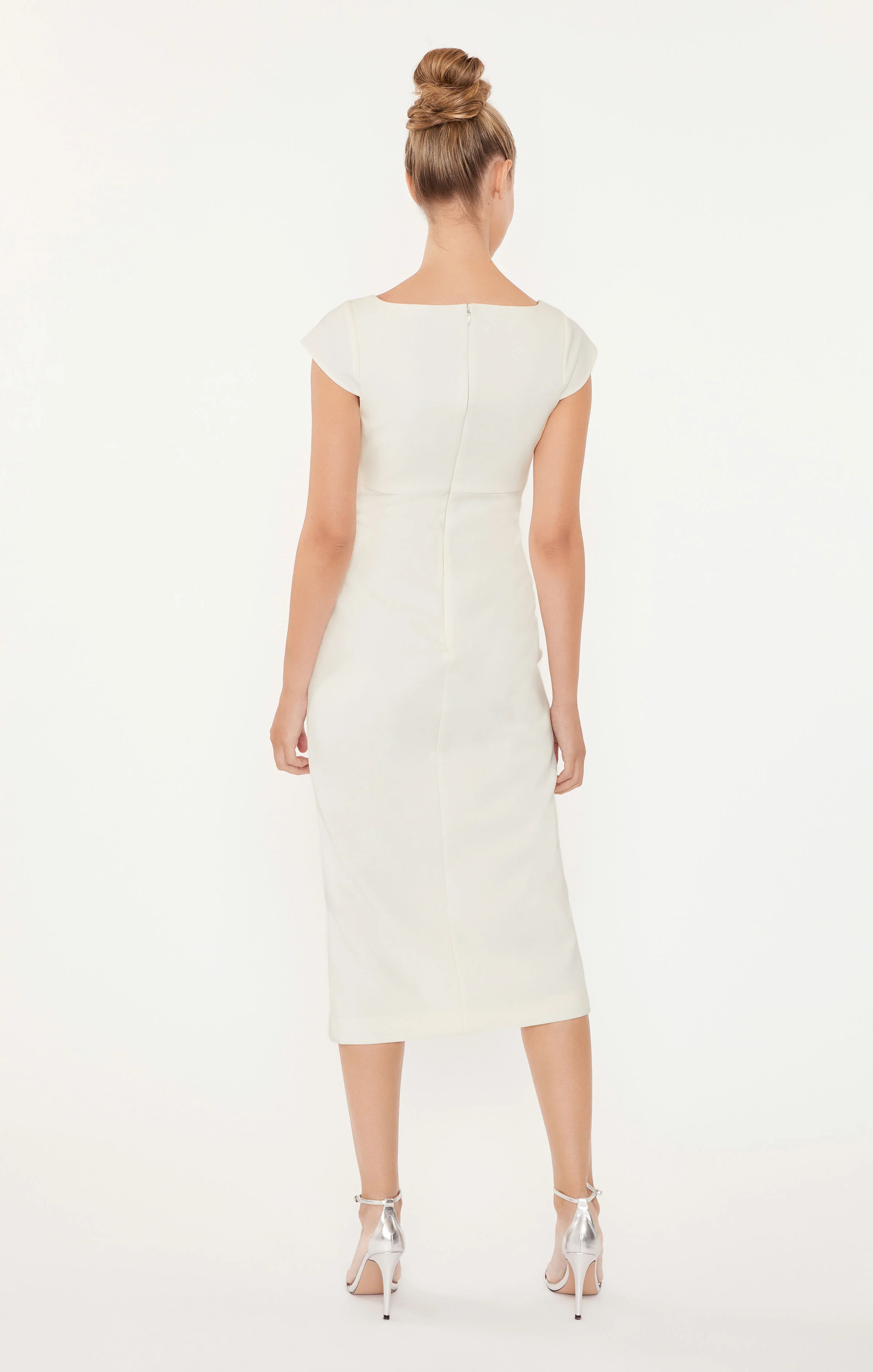 Brighten your day with our Rosalia Dress this season. Gives the classic white dress design a modern twist with its high slit and cap sleeves.