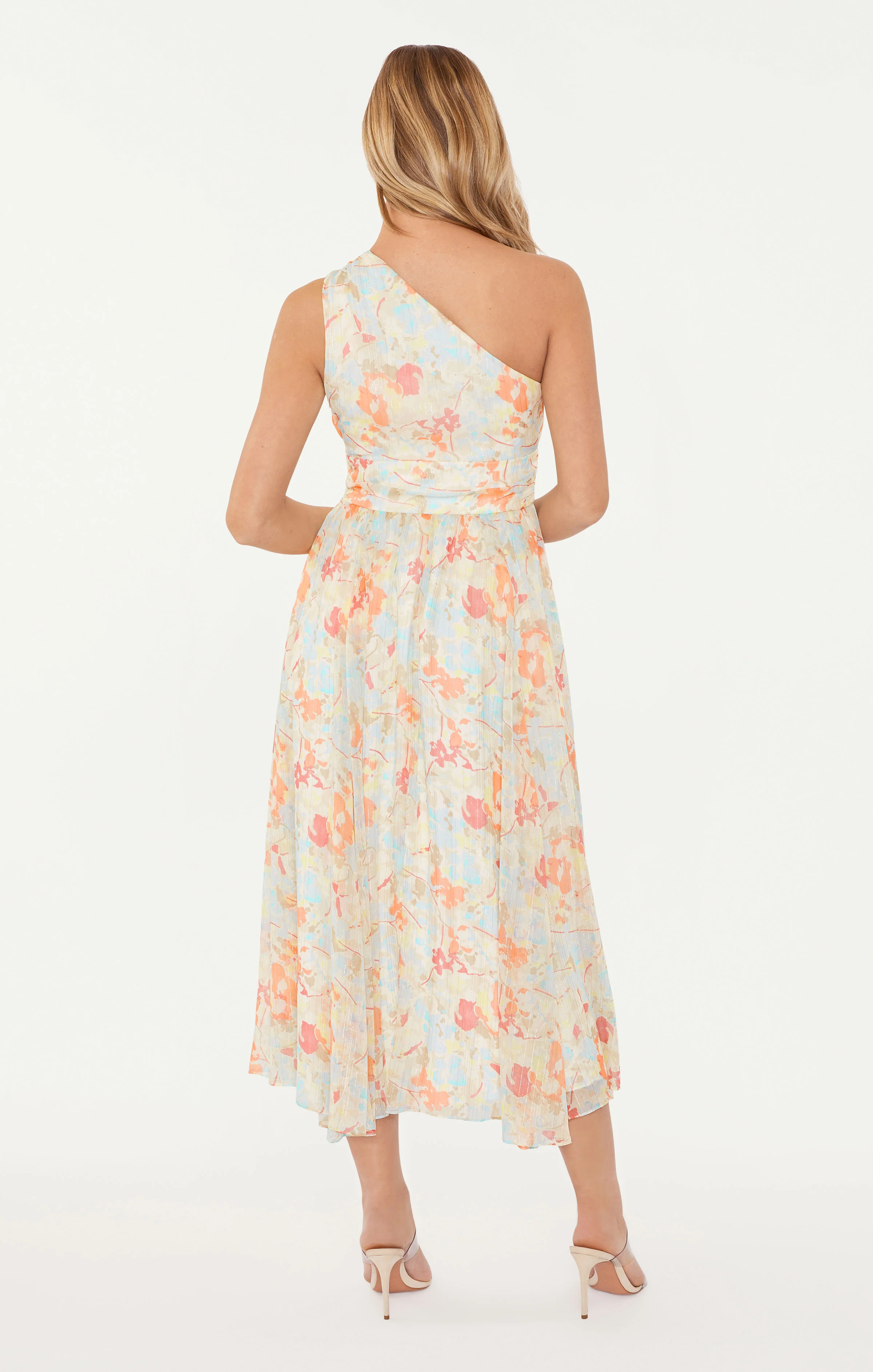 The Sara Dress features a one shoulder design and body complementing fit & flare style.
