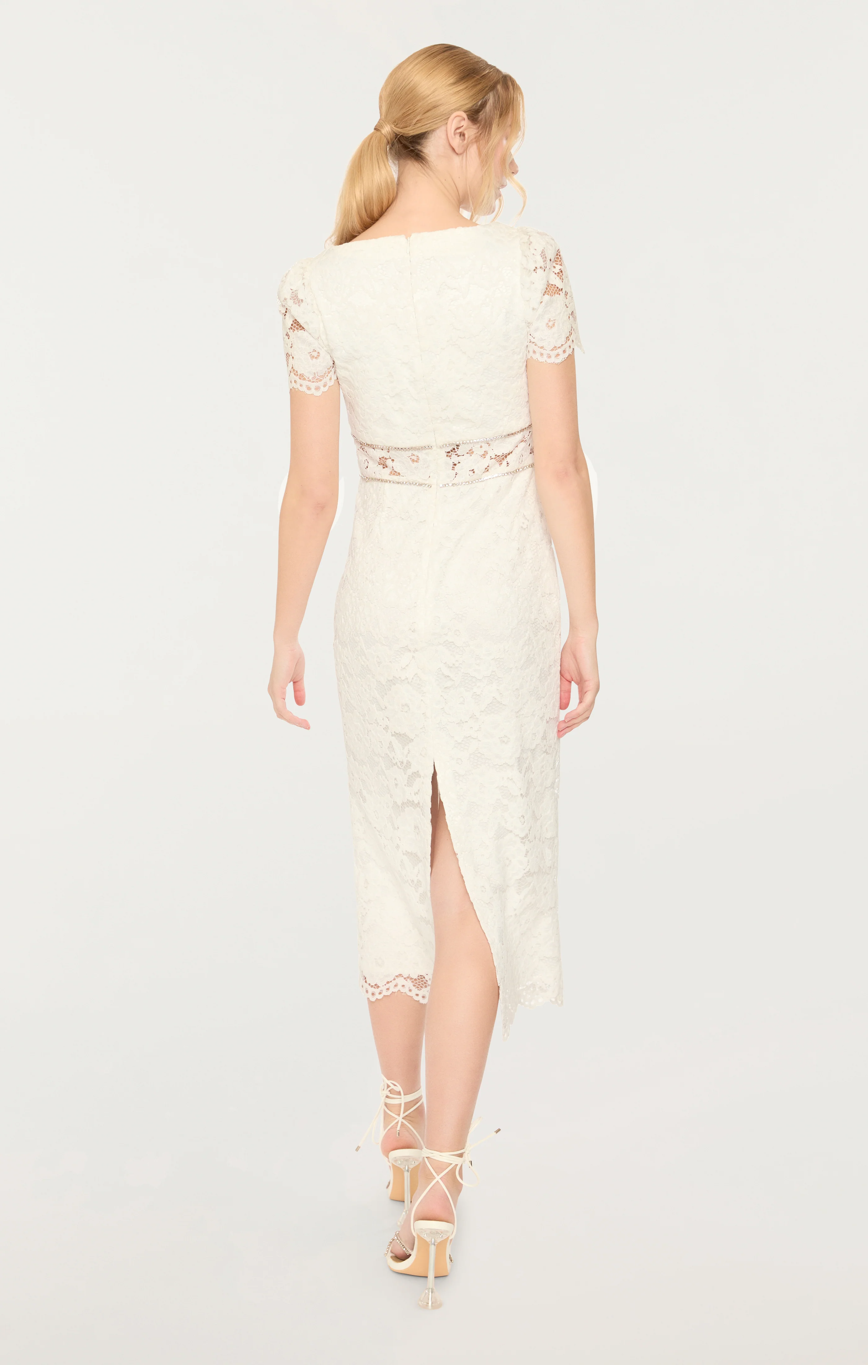 Indulge in the elegant and intricate details of the Stirling Dress - delicate Sofia lace, cap sleeves, sheer panel, and exquisite embellished buttons. Its midi length and sweetheart neckline add a touch of sophistication, while the partially lined design leaves just enough to the imagination.
